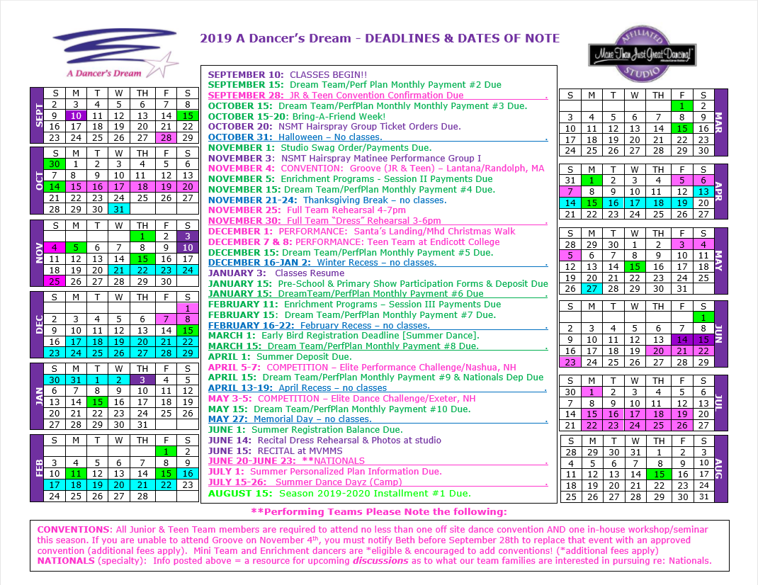 ![]() ![]() ![]() ![]() ![]() ![]() Dates & Deadlines 2018-2019**This Performance Team document will be updated for our 2019-2020 Season in early October (when our competition season events are confirmed). In the meantime, we're leaving last year's information up below so you can see how a typical season is organized in our world :o) Click HERE to download Dates & Deadlines PDF |